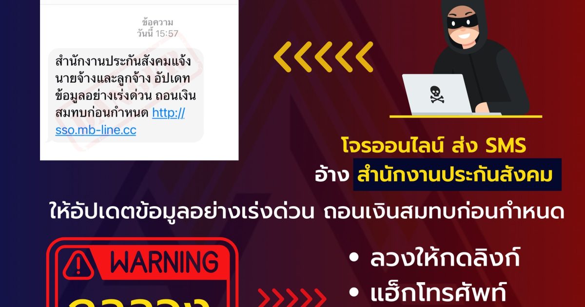 มามุกใหม่…โจรออนไลน์ ส่ง SMS ข้อความเข้าโทรศัพท์มือถือ ข้อความอ้าง “สำนักงานประกันสังคม” แจ้งนายจ้าง ลูกจ้าง อัปเดตข้อมูลด่วน ถอนเงินสมทบก่อนกำหนด พร้อมแนบลิงก์อันตราย