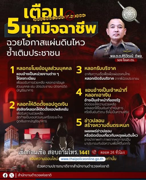 สำนักงานตำรวจแห่งชาติ เตือน 5 มุกมิจฯ ฉวยโอกาสแผ่นดินไหว ซ้ำเติมประชาชน.