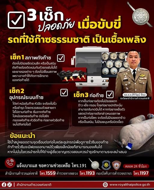 สำนักงานตำรวจแห่งชาติ แนะผู้ขับขี่รถใช้ก๊าซ ต้องเช็กสภาพถังและระบบก๊าซอยู่เสมอ เพื่อความปลอดภัย